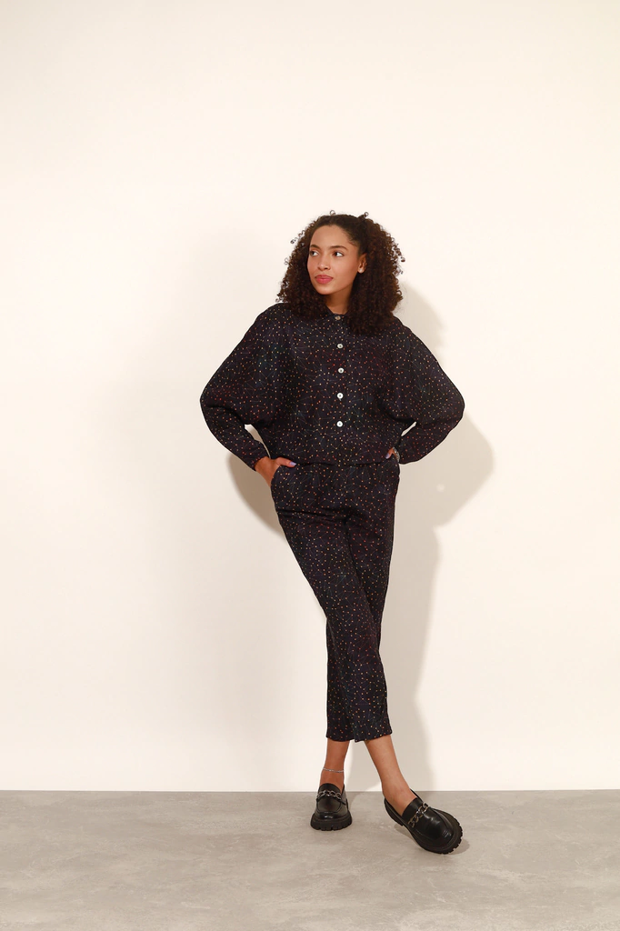 Com a mesma modelagem da antiga camisa chloe que esgotou super rápido, a camisa estrelas vem ainda mais especial por ser em uma estampa 100% autoral e exclusiva.