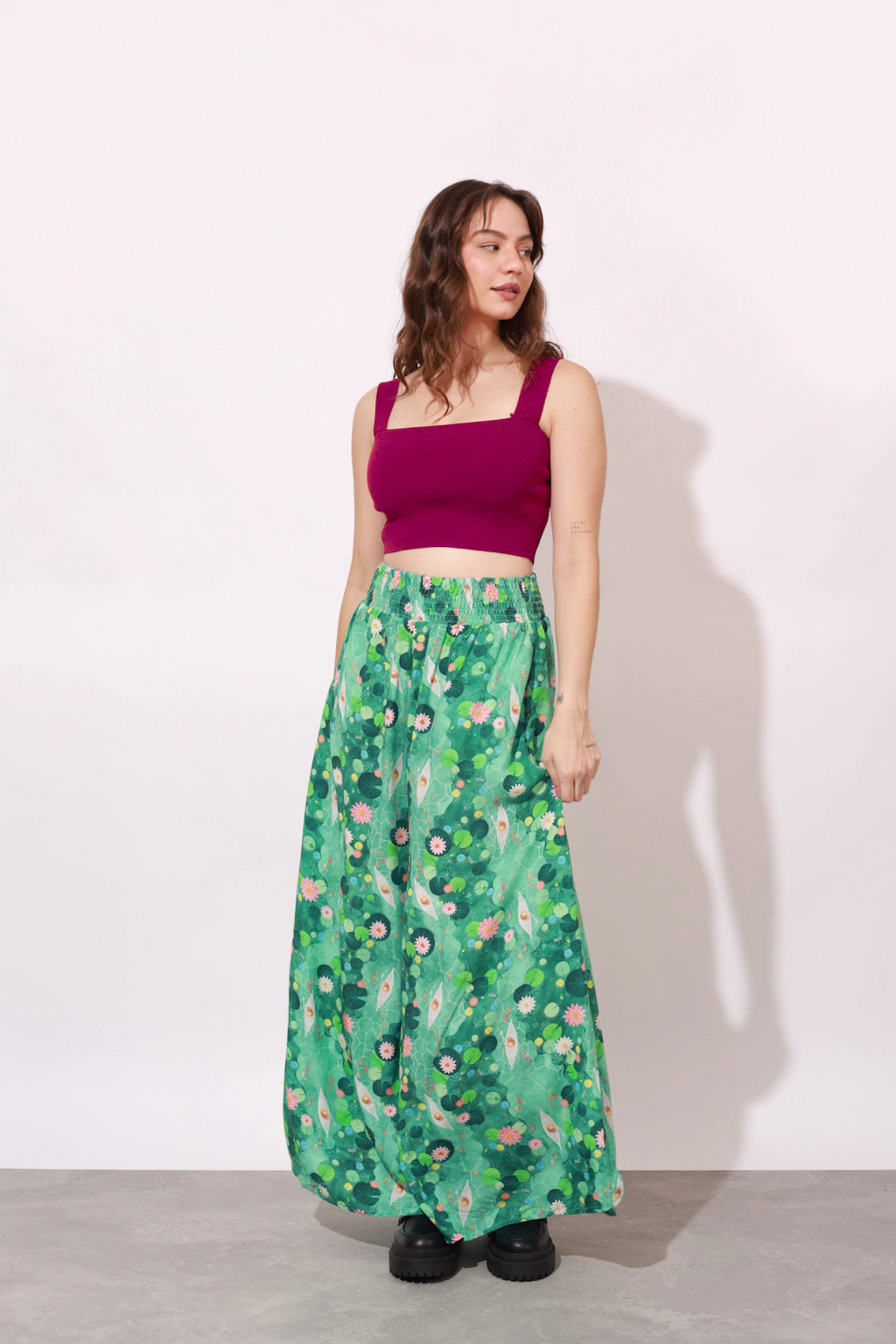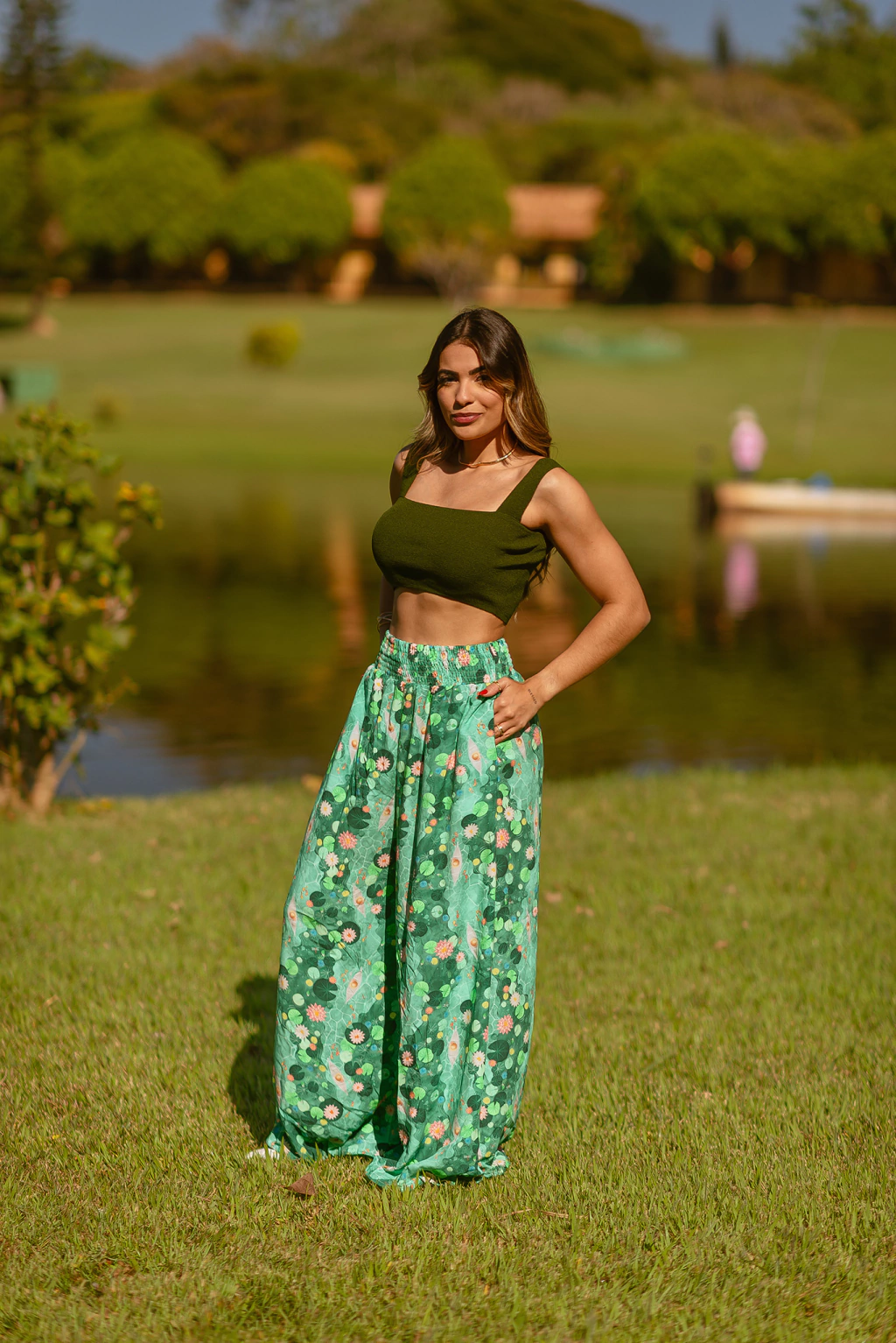 A calça saia com lastex na cintura! Veste super bem! Essa fica ainda mais especial pois é feita com estampas exclusivas 1triz no tecido de viscose.Essa nova edição adicionamos bolsos :)